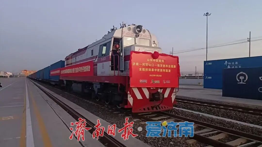 11月20日,济南董家国际铁路货运中心,一列满载着家电、轮胎、聚氨酯等产品的中欧班列缓缓驶出,将经阿拉山口铁路口岸出境,驶往匈牙利布达佩斯,预计12天后到达,这标志着山东首列全程时刻表中欧班列开行。